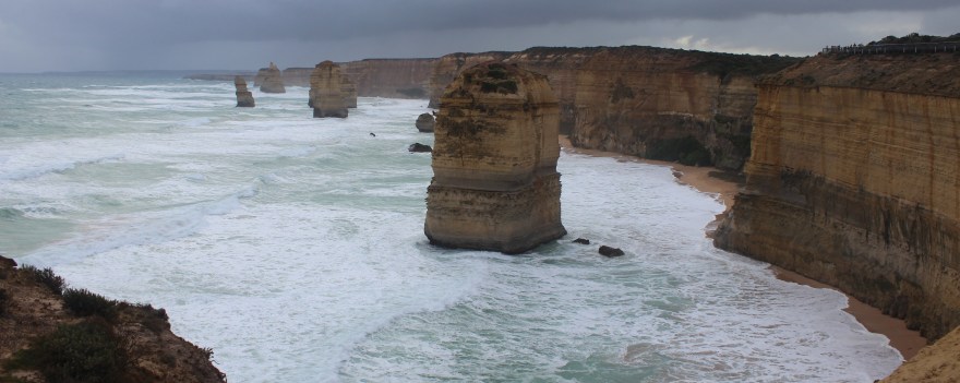 We were up bright early again, but for a day-long tour! At 7:40 am we were picked up by Go West Tours for our Great Ocean Road trip. The GOR is a 151 mile stretch of road on the southeastern coast of Australia that has many landmark stops along the way of the Southern Ocean. About an hour out of Melbourne was our first stop: the town on Torquey. This town is essentially the surfing capital of Australia, and it’s where Rip Curl got its start. We first went to see the beach which was very beautiful but very windy. A theme for this trip definitely seems to be cold (mid-40s and 50s), wind, and rain unfortunately… but we’re making the best of it! After a quick trip to look at the beach (definitely not to swim) we had brekky and hot chocolate (technically Milo). It was really delicious and felt good to have something warm us up! The whole bus ride was hot and cold, because if it got too hot in the bus the windows would fog up, so occasionally the air con would have to be turned on. We were definitely thankful for something to heat us up on this chilly morning!